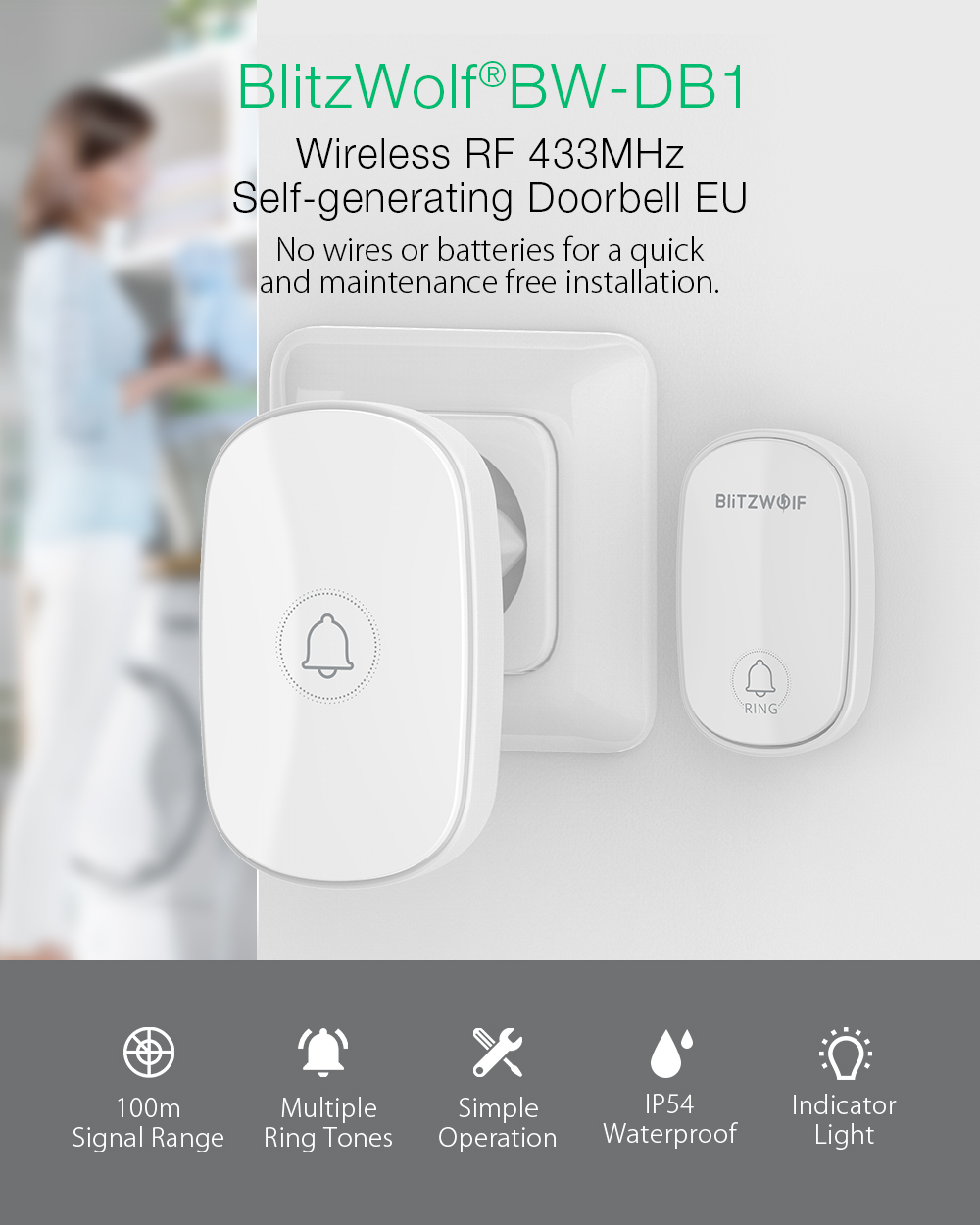 פעמון אלחוטי לדלת בליטזוולף BlitzWolf® BW-DB1 בעל עמידות למים בתקן IP54