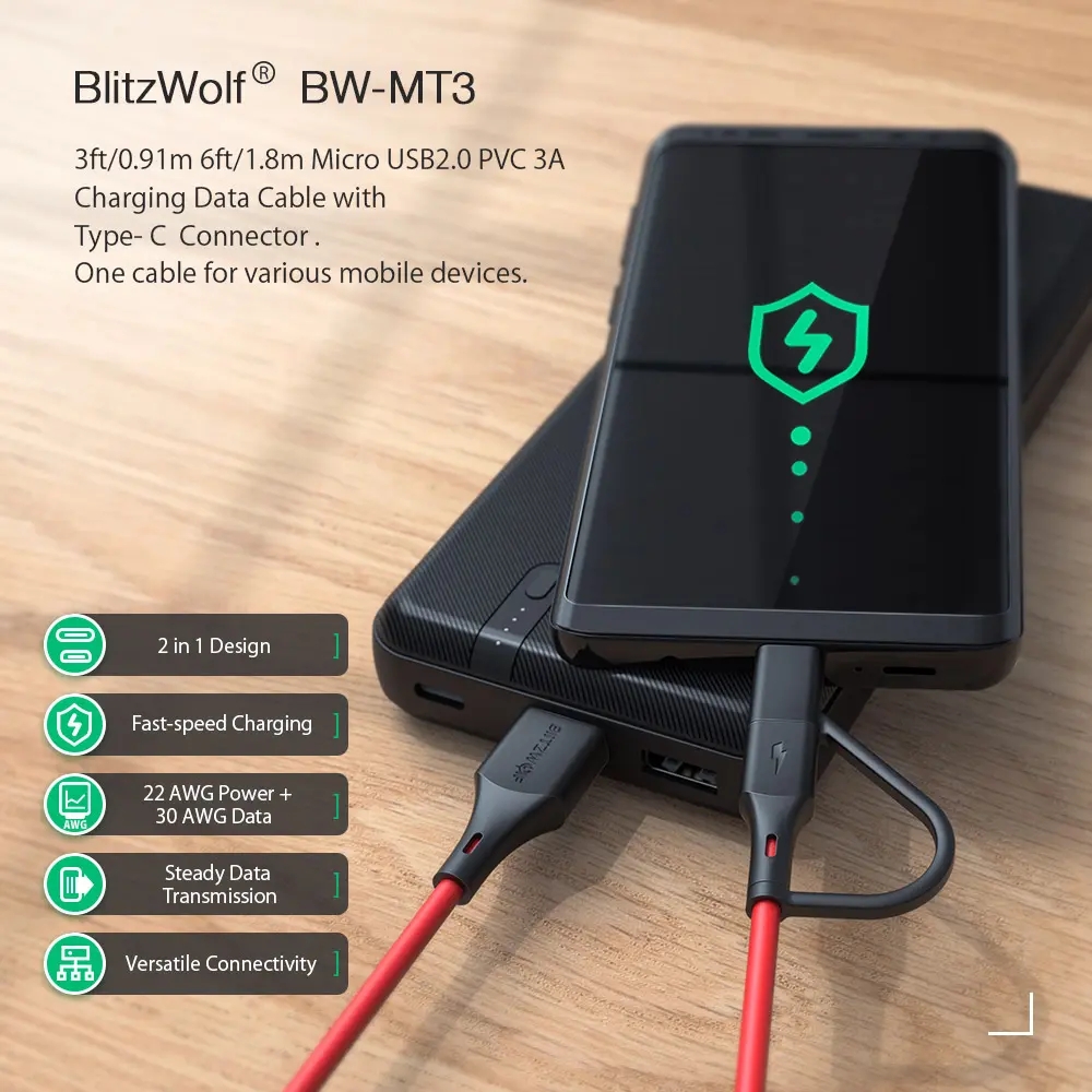 שלישיית כבלים BlitzWolf® BW-MT3 מיקרו USB כולל מתאם Type-C